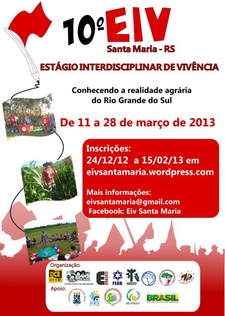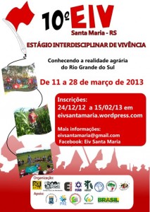 Estão abertas as inscrições para o 10º Estágio Interdisciplinar de Vivência (EIV) Santa Maria, em áreas de reforma agrária do estado do Rio Grande do Sul. Este estágio irá acontece de 11 a 28 de março de 2013, correspondendo ao período de férias da Universidade Federal de Santa Maria (UFSM). Todo e qualquer universitário de qualquer universidade e inclusive de outros países podem participar.