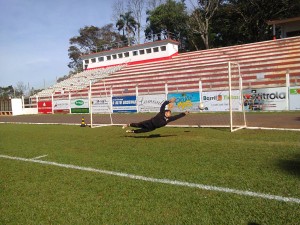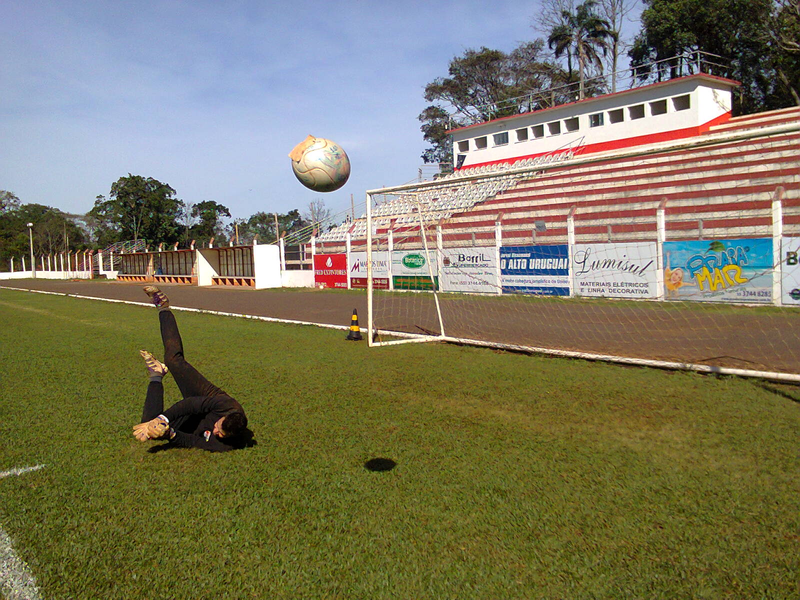 O preparador de goleiros Matheus Kendzerski coloca esparadrapos nas bolas para proporcionar efeito nas mesmas. Bruno Hepp, no detalhe, vinha sendo titular até o jogo de ontem. Foto: Eduardo Krais.