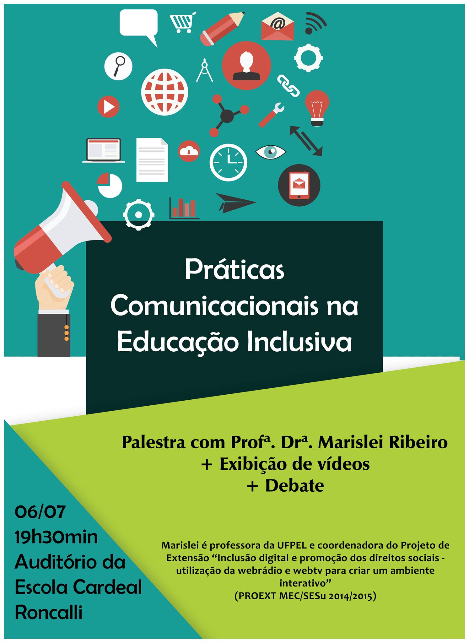 11659175_846900268693100_589933741_oA Palestra “Práticas Comunicacionais na Educação Inclusiva”, será ministrada pela Prof.ª Dr.ª Marislei Ribeiro, no dia 06 de julho (segunda-feira), às 19h30min no auditório da Escola Cardeal Roncalli, em Frederico Westphalen. Além da exposição da Profª Marislei sobre o assunto, haverá exibição de vídeos e a abertura para debate. Promovida pela UFSM-FW e pelo jornal O Alto Uruguai, a palestra é aberta à comunidade geral, mas estão convidados, em especial, os acadêmicos de Comunicação Social da UFSM/FW, acadêmicos da URI/FW, UNOPAR, UERGS, escolas de ensino médio e entidades de classe.